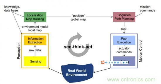 機(jī)器人天然的工作模式是“see-think-act”,所以自然而然的就形成了“傳感——計(jì)劃——行動(dòng)”(SPA)結(jié)構(gòu):從感知進(jìn)行映射,經(jīng)由一個(gè)內(nèi)在的世界模型構(gòu)造,再由此模型規(guī)劃一系列的行動(dòng),最終在真實(shí)的環(huán)境中執(zhí)行這些規(guī)劃。與之對(duì)應(yīng)的軟件結(jié)構(gòu)稱為經(jīng)典模型,也稱為層次模型、功能模型、工程模型或三層模型,這是一種由上至下執(zhí)行的可預(yù)測(cè)的軟件結(jié)構(gòu)。