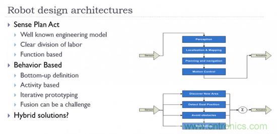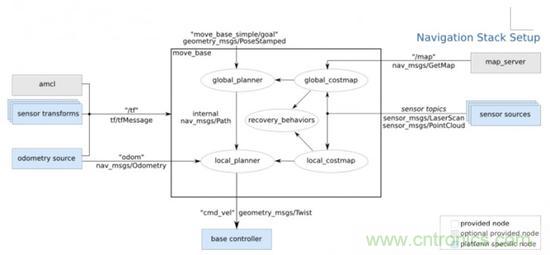 沒(méi)有萬(wàn)靈的結(jié)構(gòu),混合系統(tǒng)結(jié)合了SPA和反應(yīng)體系的原理,將多種混合系統(tǒng)應(yīng)用于在傳感器和電機(jī)輸出間進(jìn)行協(xié)調(diào)來(lái)完成任務(wù)。混合結(jié)構(gòu)相結(jié)合最具吸引力的好處可能是:系統(tǒng)按照有利于完成任務(wù)的標(biāo)準(zhǔn)進(jìn)行設(shè)計(jì),而非刻板的遵循某一教條。但再?gòu)?fù)雜的機(jī)構(gòu),基本上也都是二者的組合。以ROS的導(dǎo)航包為例: