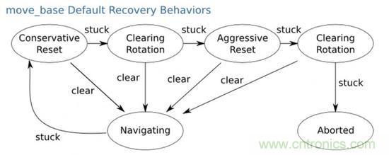 如果世界是完美的,那按照規(guī)劃的地圖行進(jìn)到目的地就完事了。然而基于行為方法就是為了處理各種意外而生的。當(dāng)機(jī)器人遇到障礙物或是被卡住的時(shí)候,內(nèi)嵌的基于行為的系統(tǒng)就開(kāi)始發(fā)揮作用。會(huì)根據(jù)情況,在“行為庫(kù)”recovery_behaviors中調(diào)用某一預(yù)先設(shè)定的“行為”來(lái)擺脫困境。