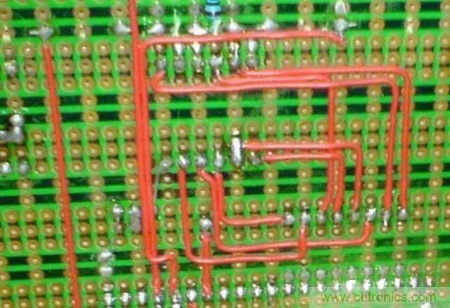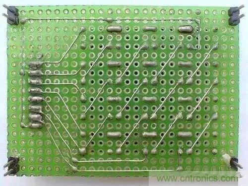 對于萬能板的焊接方法,一般是利用前面提到的細(xì)導(dǎo)線進(jìn)行飛線連接,飛線連接沒有太大的技巧,但盡量做到水平和豎直走線,整潔清晰如下圖。