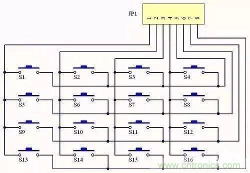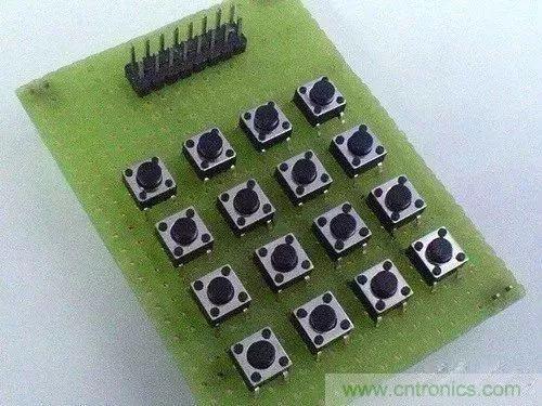 圖a是矩陣鍵盤電路,圖b是筆者焊接的矩陣鍵盤。這是一個利用了元器件自身結(jié)構(gòu)的典型例子:圖b中的輕觸式按鍵有4只腳,其中兩兩相通,我們便可以利用這一特點來簡化連線,電氣相通的兩只腳充當(dāng)了跳線。讀者可以對照圖c好好體會一下。