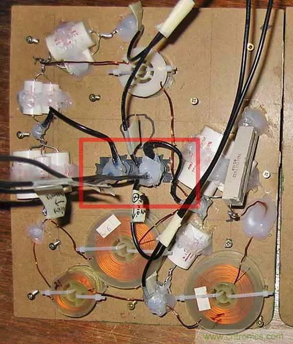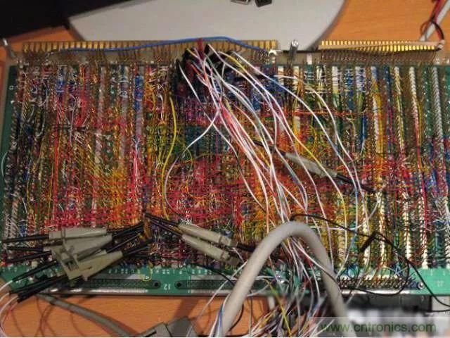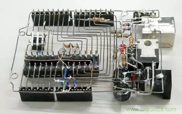 對于元器件在萬能板上的布局,大多數(shù)人習(xí)慣“順藤摸瓜”,就是以芯片等關(guān)鍵器件為中心,其他元器件見縫插針的方法。這種方法是邊焊接邊規(guī)劃,無序中體現(xiàn)著有序,效率較高。但由于初學(xué)者缺乏經(jīng)驗,搭出來的板是這樣的……
