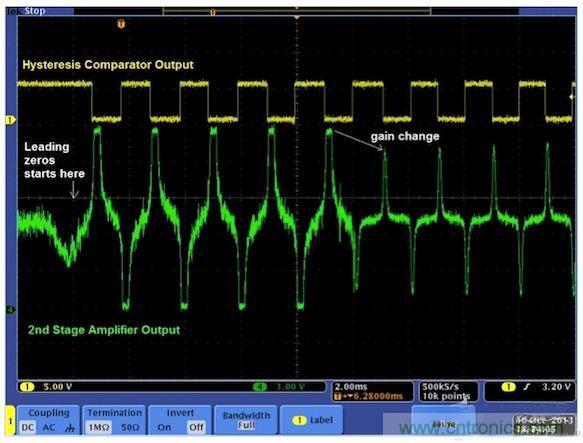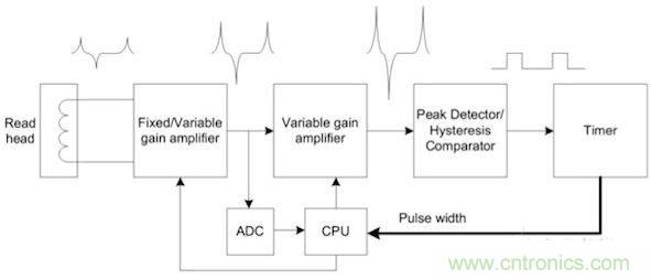 圖6顯示了一個(gè)完整的系統(tǒng)。最好將放大電路做成兩級(jí),用ADC接收第一級(jí)電路的輸出。這樣就無需高分辨率ADC,8位ADC就足以滿足這種應(yīng)用需求。第一級(jí)可以是固定增益的放大器,也可以是可變?cè)鲆娣糯笃?。第二?jí)是可變?cè)鲆娣糯笃鳌PU讀取ADC結(jié)果,并通過調(diào)整增益使第二級(jí)放大器的信號(hào)輸出達(dá)到最佳。第二級(jí)放大器的輸出送到峰值檢測器/磁滯比較器電路進(jìn)行峰值檢測。來自檢測器的脈沖輸出被饋送至定時(shí)器進(jìn)行時(shí)間差測量,然后由CPU解碼出1和0。