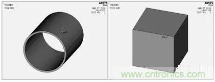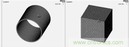 網(wǎng)格劃分對有限元的求解及其重要,單元越小,網(wǎng)格越細(xì),則離散域的近似度越好,計(jì)算結(jié)果也越精確,但計(jì)算量及誤差都將增大。本文建立的線圈模型是一個(gè)規(guī)則的柱體,采用體掃掠方式劃分網(wǎng)格??諝饽P徒?jīng)過澆筑之后形狀變得復(fù)雜,采用自由方式劃分網(wǎng)格。圖2為線圈和空氣的有限元模型,最后通過numcmp命令將其澆筑在一起。