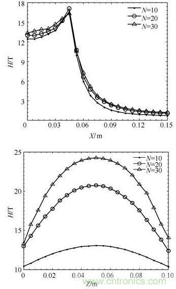 圖9:不同匝數(shù)下磁場強(qiáng)度H分布曲線
