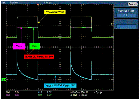 圖2是當(dāng)移走D1時(shí),35V拋負(fù)載脈沖下放大器的輸出。施加電壓為電池標(biāo)稱電壓,所要求的輸出電壓為1V (輸入VSENSE = 50mV、增益 = 20)。出現(xiàn)拋負(fù)載電壓時(shí),齊納管把輸入共模電壓鉗位在大約24V,放大器輸出經(jīng)過幾個(gè)短暫的波動(dòng)后穩(wěn)定到0V。