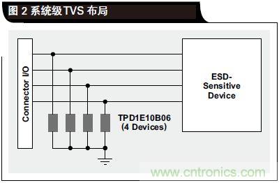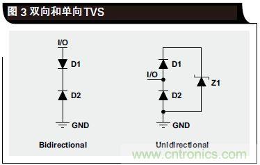 立即沿這條通路接地。在單向 TVS 情況下,只要 D2 和Z1 都不進(jìn)入其擊穿區(qū)域,則電壓信號(hào)會(huì)在接地電壓以上擺動(dòng)。當(dāng)正ESD電擊擊中I/O線路時(shí),D1變?yōu)檎蚱?,而Z1 先于 D2 進(jìn)入其擊穿區(qū)域;通過(guò) D1 和 Z1 形成一條接地通路,從而讓 ESD 能量得到耗散。當(dāng)發(fā)生負(fù)ESD 事件時(shí),D2 變?yōu)檎蚱?,ESD能量通過(guò) D2接地通路得到耗散。由于 D1 和 D2 尺寸可以更小、寄生電容更少,單向二極管可用于許多高速應(yīng)用;D1 和 D2 可以“隱藏”更大的齊納二極管 Z1(大尺寸的原因是處理?yè)舸﹨^(qū)域更多的電流)。
