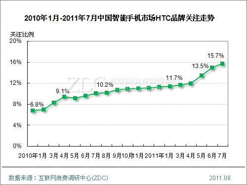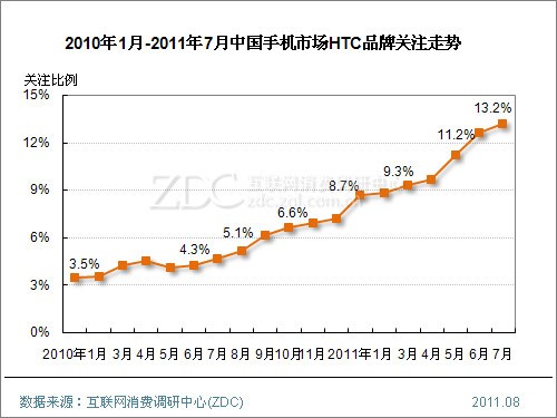 ZDC統(tǒng)計數(shù)據(jù)顯示,中國整體手機市場上,2010年1月至今,HTC品牌關(guān)注比例呈現(xiàn)出直線上升走勢,2010年1月僅為3.5%,如今已經(jīng)達到13.2%,且在中國手機市場品牌排名中躋身前三甲。