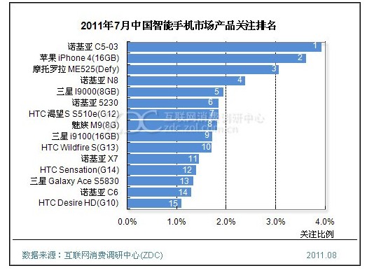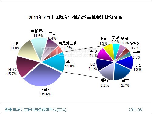(圖) 2011年7月中國智能手機市場品牌關(guān)注比例分布[page]