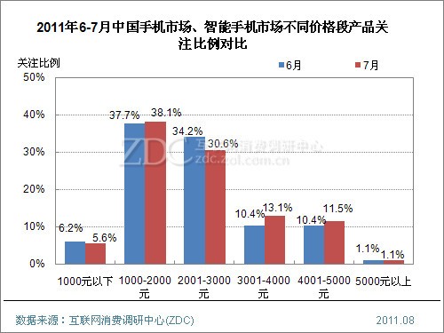 (圖) 2011年6-7月中國智能手機市場不同價格段產(chǎn)品關(guān)注比例對比