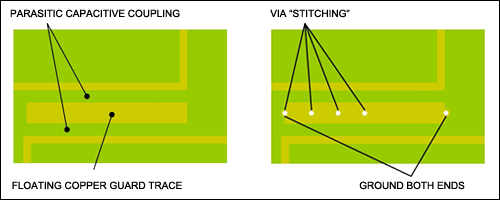 填充地也稱(chēng)為保護(hù)線,通常將其用于電路中很難鋪設(shè)連續(xù)接地區(qū)域或需要屏蔽敏感電路的設(shè)計(jì)(圖10)。通過(guò)在引線兩端,或者是沿線放置接地過(guò)孔(即過(guò)孔陣列),增大屏蔽效應(yīng)。請(qǐng)不要將保護(hù)線與設(shè)計(jì)用來(lái)提供返回電流通路的引線相混合,這樣的布局會(huì)引入串?dāng)_。