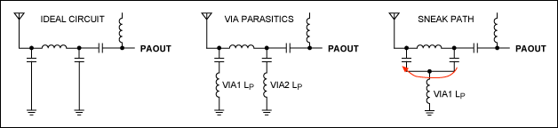 寄生電感往往對(duì)旁路電容的連接影響很大。理想的旁路電容在電源層與地層之間提供高頻短路,但是,非理想過(guò)孔則會(huì)影響地層和電源層之間的低感通路。典型的PCB過(guò)孔(d = 10 mil、h = 62.5 mil)大約等效于一個(gè)1.34nH電感。給定ISM-RF產(chǎn)品的特定工作頻率,過(guò)孔會(huì)對(duì)敏感電路(例如,諧振槽路、濾波器以及匹配網(wǎng)絡(luò)等)造成不良影響。