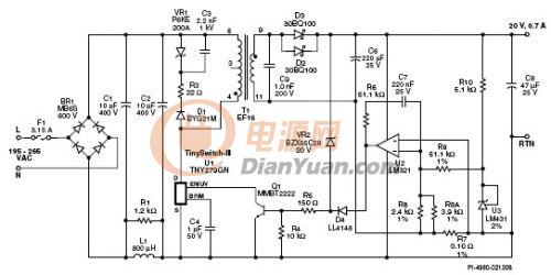 圖1所示為一個典型的20 V、14 W恒壓(CV)、恒流(CV)輸出的電源電路。LED陣列的光輸出量與所流經(jīng)的電流量成正比。因此,LED驅動器應具有恒流輸出,而不是恒壓輸出。在本設計中,DC輸出未與AC輸入隔離,因而LED陣列和外殼應與用戶安全地隔離開來。