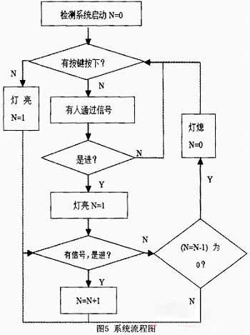 系統(tǒng)流程圖如圖5所示。其中N表示洗手間內(nèi)現(xiàn)有的人數(shù),當(dāng)檢測系統(tǒng)電源連上后,光電傳感器開始檢測,但系統(tǒng)不知道洗手間內(nèi)此時(shí)是否有人,默認(rèn)是無人,因而燈是不會(huì)亮的,這時(shí)按鍵可以用來對系統(tǒng)進(jìn)行調(diào)整。當(dāng)光強(qiáng)增大到一定值時(shí),檢測系統(tǒng)自動(dòng)停止工作。