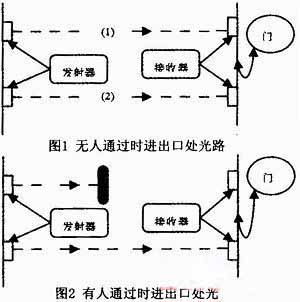 本設(shè)計(jì)的改進(jìn)之處是設(shè)計(jì)一個(gè)具有計(jì)數(shù)功能的模塊,我們可以使用對射型光電傳感器,如圖1所示在洗手間的進(jìn)口處設(shè)置兩個(gè)發(fā)射源和兩個(gè)接收源,當(dāng)有人進(jìn)或者出洗手問的門時(shí),會(huì)阻擋光線,如圖2所示,接收處就接收不到設(shè)置光源發(fā)出的光信號(hào),這時(shí)接收處的輸出端會(huì)發(fā)出一個(gè)信號(hào),計(jì)數(shù)器就可以通過此信號(hào)進(jìn)行計(jì)數(shù)。只要計(jì)數(shù)器里存儲(chǔ)數(shù)等于一時(shí),系統(tǒng)控制燈亮,大于零時(shí),該系統(tǒng)就會(huì)控制燈一直亮著,一旦為零,系統(tǒng)會(huì)控制燈延時(shí)一小段時(shí)間后自動(dòng)熄滅。由于整個(gè)系統(tǒng)初啟動(dòng)時(shí)無法判斷室內(nèi)是否有人,因而我們還會(huì)設(shè)置一個(gè)簡易開關(guān),供使用者進(jìn)行手控,且為方便使用者能在夜間看到開關(guān)的位置,我們可以采用表面具有夜光性能的材料來做按鍵。光電檢測系統(tǒng)的啟動(dòng)由光敏傳感器控制。