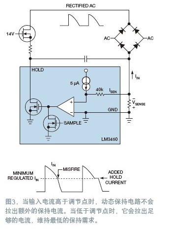 獲得效率最大化的最佳方式是調(diào)節(jié)最低輸入電流。采用這種方法時(shí),當(dāng)輸入電流高于調(diào)節(jié)點(diǎn)時(shí),不會(huì)拉出額外的保持電流。當(dāng)輸入電流低于調(diào)節(jié)點(diǎn)時(shí),電路會(huì)拉出足夠的電流以維持最小的保持要求,LM3450控制器實(shí)現(xiàn)了這種方法,叫做動(dòng)態(tài)保持(圖3)。它在二極管橋回返以及系統(tǒng)地之間有一只檢測(cè)電阻,提供了一種輸入電流的檢測(cè)方法。通過電阻上檢測(cè)到的電壓,控制器就可以線性地從保持管腳拉出電流,以維持最小的調(diào)節(jié)輸入電流。這樣就確保了額外功耗處于最小值狀態(tài)。