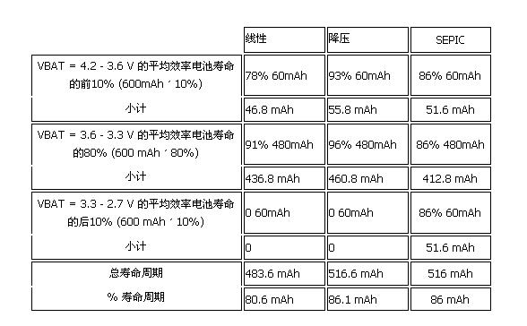 無論DSP 或模擬數(shù)字轉(zhuǎn)換器等數(shù)字零件,或是電源管理系統(tǒng)等模擬零件,2G 電話幾乎不提供任何的功能整合,系統(tǒng)設(shè)計人員在發(fā)展電源管理系統(tǒng)時,通常會以成本和體積為優(yōu)先考慮,而不是轉(zhuǎn)換效率。線性穩(wěn)壓器只能將輸入電壓轉(zhuǎn)換成更低的輸出電壓,因此電池電壓必須高于3.3V,此時可利用低電流或中電流的線性穩(wěn)壓器進行電壓轉(zhuǎn)換,以便提供電力給至2.8V 范圍內(nèi)的其它電源需求。在3G 芯片組中,基頻處理器現(xiàn)已包含DSP、微處理器/微控制器、模擬數(shù)字轉(zhuǎn)換器和數(shù)字模擬轉(zhuǎn)換器,用來控制射頻訊號和音頻訊號處理。這顆處理器的核心電壓已降至1.2V 或是更低,I/O 和外圍電壓也開始減少至2.5V 至3.0V 范圍;由于3.xG 電話的電流需求通常都超過2.G 電話,3.xG 設(shè)計人員需要效率高于線性穩(wěn)壓器的直流電源轉(zhuǎn)換器,以便提供更長的電池使用時間。為進一步延長電池壽命,許多設(shè)計人員必須盡量利用鋰離子電池電力,直到其電壓降至 最小值為止;在此過程中,如何產(chǎn)生3.3V 電壓就變成一項挑戰(zhàn)。從表面上來看,設(shè)計人員若能繼續(xù)使用電池直到2.7V,并利用正電源降壓—升壓轉(zhuǎn)換器或是SEPIC 轉(zhuǎn)換器提供3.3V 電源,可攜式裝置的電池壽命就會大幅延長,但是根據(jù)(表一)針對600mAh 電池所做的簡單分析可發(fā)現(xiàn)情形并非如此,因為無論是采用效率更高的降壓轉(zhuǎn)換器,并將電池使用到3.3V,或是采用SEPIC 之類的轉(zhuǎn)換器,并將電池電力完全用盡,這兩種方式的供電時間幾乎沒有任何區(qū)別。