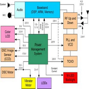 不同的智能型手機零件有著不同的電源需求,(圖二)是行動電話中需要電源的主要零件簡單方塊圖,例如射頻單元的壓控振蕩器(VCO)以及鎖相回路(PLL)就需要極低噪聲和很高電源拒斥比的電源,確保它們提供最高的傳送和接收效能,因此雖然線性穩(wěn)壓器的效率不高,但由于它沒有輸出漣波,所以是這類電源供應的最佳選擇;同樣重要的是將直流轉(zhuǎn)換器的開關(guān)頻率,還有它們的二階和三階諧波,都保持在中頻頻帶之外。由于DSP 和中央處理器的核心電壓已降至1V 左右,以電感為基礎(chǔ)的高效率交換式降壓轉(zhuǎn)換器是理想選擇。至于屏幕背光照明所使用的白光二極管,其電源可來自電荷泵浦或電感式升壓/降壓轉(zhuǎn)換器。