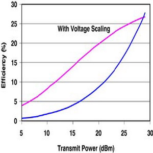 動態(tài)/可適性電壓調(diào)整技術(shù)(DVS/AVS)與高整合度組件所使用的方式很類似,它會把閉回路系統(tǒng)中的處理器和穩(wěn)壓器連結(jié)在一起,并在確保系統(tǒng)正常工作的情形下,將數(shù)字電源供應的輸出電壓動態(tài)調(diào)整至最小值。功率放大器會被最佳化,使它在最大傳送功率下?lián)碛凶罡咝省S捎诮^大多數(shù)手機都在基地臺附近工作,手機的無線電功能會在維持通訊質(zhì)量的前題下,將傳送功率降至最低水平。當功率放大器在較低的功率水平下工作時,它的效率會受到影響,從(圖三)可以看出,利用動態(tài)電壓調(diào)整技術(shù)來調(diào)整功率放大器的電壓,它的工作效率會增加10%至20%。