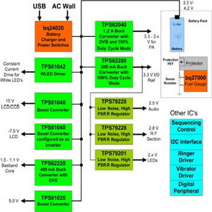 在這個解決方案中,就算鋰離子電池下降至3.3V 左右,在100%負載周期模式下工作的高效率TPS62200降壓轉(zhuǎn)換器仍能提供3.3V 的I/O電壓。上述所有零件都采用SOT-23 封裝,除了bq24020 電池充電組件、TPS61020 升壓轉(zhuǎn)換器以及TPS61042 白光二極管驅(qū)動組件之外,它們是采用3×3 平方厘米的QFN 封裝。TPS61040 和TPS61042 還內(nèi)建上端FET 晶體管,每顆組件只需要一個外接二極管。bq24020、TPS622xx、TPS61020 和線性穩(wěn)壓器組件全都內(nèi)建FET 晶體管,功率放大器和中央處理器電源采用的動態(tài)電壓調(diào)整技術(shù)可以提高每顆零件的效率,進而協(xié)助降低功耗。