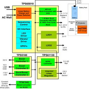 在此解決方案中,3.3V I/O 電源是由SEPIC 轉(zhuǎn)換器提供,它讓應用系統(tǒng)能充份利用鋰離子電池電力,直到電池電壓降至最低水平(大約2.7V)。和離散解決方案一樣,穩(wěn)壓器輸出也來自3.3V 輸入電源,以便提高工作效率。TPS65010 采用48 只接腳QFN 封裝,這些組件都內(nèi)建FET 晶體管。TPS61130 SEPIC 轉(zhuǎn)換器采用4×4 平方厘米QFN 封裝,并且內(nèi)建FET 晶體管,最高達到90%以上效率,TPS5100 則是三通道輸出控制器,專門用來提供電源給顯示器。功率放大器和中央處理器電源使用的動態(tài)電壓調(diào)整技術(shù)可以改善每顆零件的效率,進而協(xié)助降低功耗。