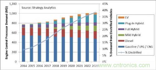 在這些發(fā)動機控制應(yīng)用程序當中,來自電動汽車動力系統(tǒng)的處理器需求增速遠遠高于傳統(tǒng)汽油和柴油動力汽車。如上圖所示,到 2023 年,超過 37% 的發(fā)動機控制處理器需求將來自電動汽車。這個比例明顯高于電動汽車 15% 的產(chǎn)量份額,因為不少電動汽車都是混合動力汽車,同時需要對汽油/柴油發(fā)動機和電動機/變頻器/電池進行控制。