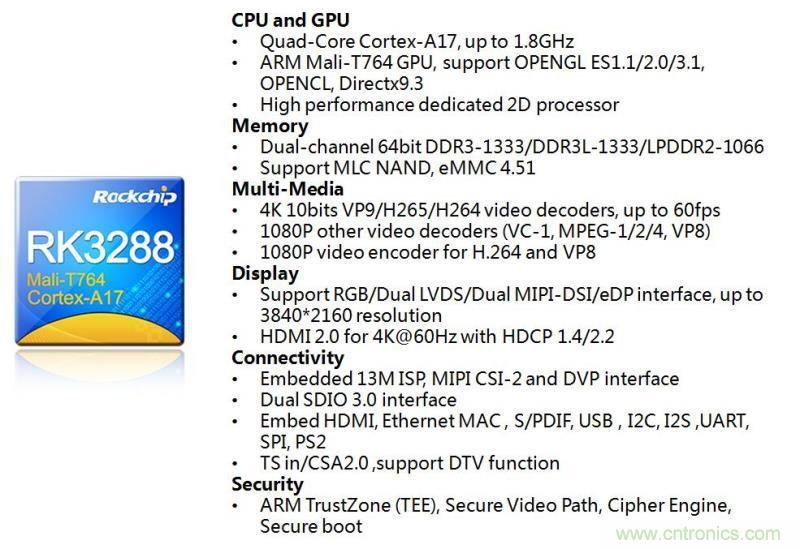 性能方面,RK3288基于28nm HKMG工藝,處理器采用了四核ARM Cortex-A17,主頻達到了1.8GHz。DDR控制器采用雙通道64bits DDR3/DDR3L/LPDDR2設計。GPU采用四核Mali-T7系列GPU,頻率高達600MHz。該芯片內(nèi)置了2D/3D圖形GPU加速處理器,完美支持OpenGL ES 1.1/2.0/3.1、OpenCL 1.1、DirectX9.3,在3D效果方面相較同類產(chǎn)品有較大的提升。RK3288還支持全部主流視頻格式解碼,支持H.265和4Kx2K分辨率視頻解碼。