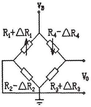 其輸出電壓表示為vo=KAR/R(Rl=如=R3=R4,△R1=△R3=△R2=△R4)。