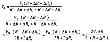 如圖2傳感器輸出電壓信號(hào)Vo=VB△R/R(R1=R2=R3=R4,△R1=△R2=△R3=△R4),在理想狀態(tài)下其信號(hào)輸出是一個(gè)線性變化值。但是單晶硅材料的傳感器屬于半導(dǎo)體傳感器其受溫度的影響比較大。這使得傳感器在環(huán)境溫度變化時(shí)輸出呈現(xiàn)變化,影響讀出精度。對(duì)圖2的電橋加入溫度對(duì)電橋的影響得出下式: