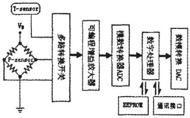 在溫度傳感器的輔助作用下通過(guò)信號(hào)轉(zhuǎn)換開(kāi)關(guān)分時(shí)讀取壓力與溫度的數(shù)值,通過(guò)可編程增益放大器將微弱信號(hào)放大,再經(jīng)過(guò)ADC量化傳感器的信號(hào)進(jìn)入數(shù)字處理器計(jì)算當(dāng)前溫度和壓力下的補(bǔ)償后壓力輸出給數(shù)模轉(zhuǎn)換DAC輸出模擬信號(hào)。而溫度補(bǔ)償則可以通過(guò)通訊接口將參數(shù)寫(xiě)入EEPROM供數(shù)字處理器計(jì)算時(shí)調(diào)用。如此多的功能部件均可集成制作在一塊單一芯片上,使得ASIC電路很容易和MEMS技術(shù)制作的壓力敏感芯片封裝在一個(gè)小巧的殼體中。